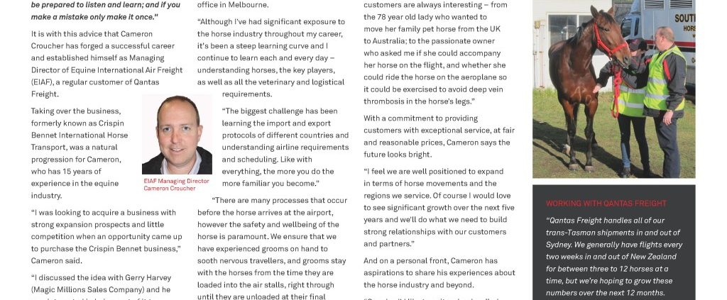 Recently Equine International Airfreight’s Managing Director Cameron Croucher was interviewed by the team at Qantas Freight. Cameron discussed the processes behind moving horses international and acquiring the company (formerly Crispin Bennett International Horse Transport) along with Magic Millions owner Gerry Harvey. Read the full Interview by clicking on the article below.